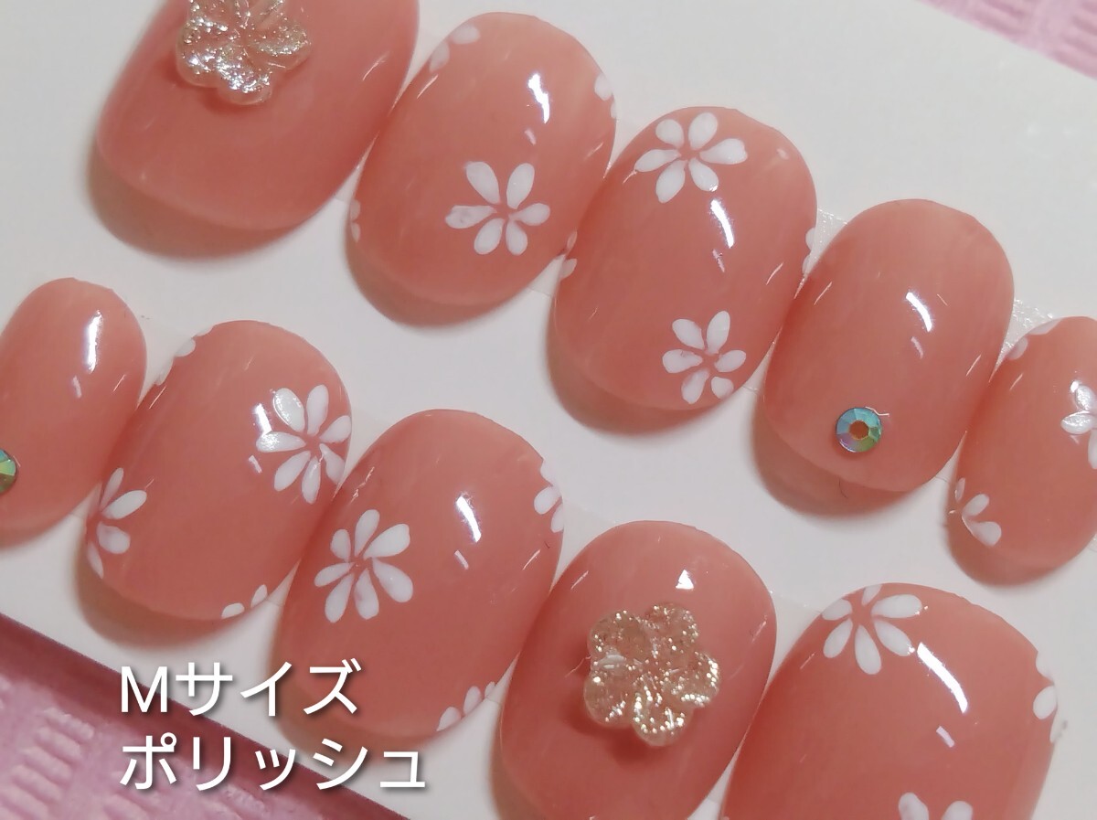 - Mサイズベリーショート・ベージュベース小花ペイントキラキラフラワーパーツネイルチップハンドメイド