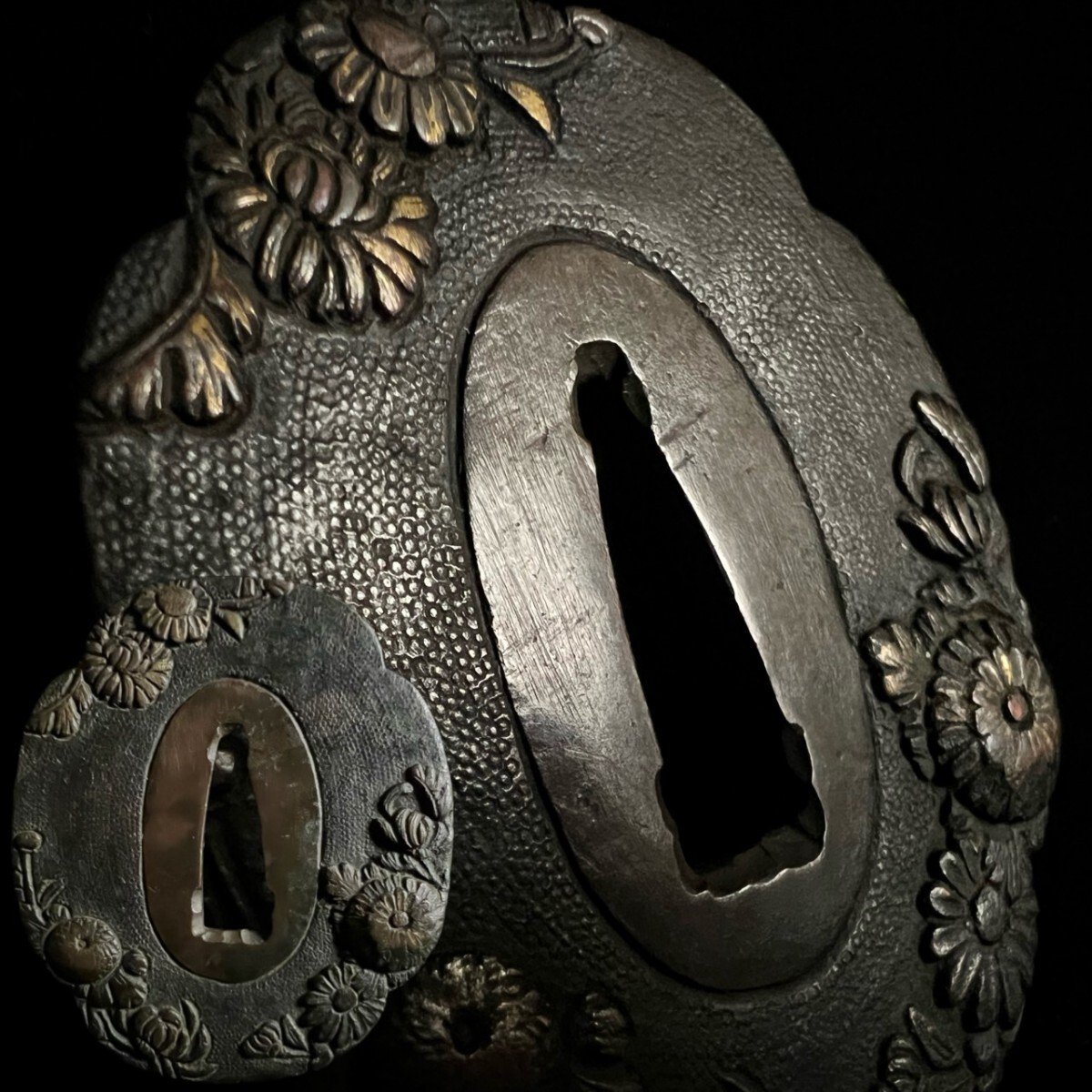 - ◇鸛◇ 刀剣美術 時代本歌 無銘 赤銅魚子地 菊花彫刻木瓜形鍔 6.05cm 76g 桐箱付 金色絵 美濃 水戸 長州 脇差 短刀 刀装具 鐔 刀剣武具骨董