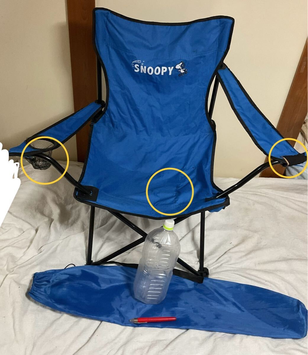 - 折り畳み椅子 携帯椅子 座面幅45奥行47高37 収納時 長80cm 1.8kg 青 SNOOPY ボトル置ネット他破れ補修跡複数 500円超10%オマケ 120