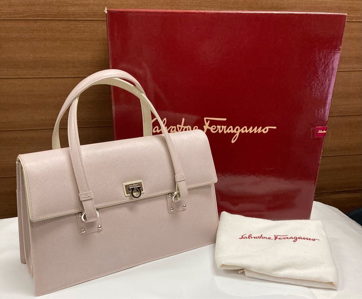> 未使用♪ Salvatore Ferragamo サルヴァトーレ フェラガモ ガンチーニ 正規品 レザー 本革 ハンドバッグ 革 ベージュピンク 保存袋・箱付