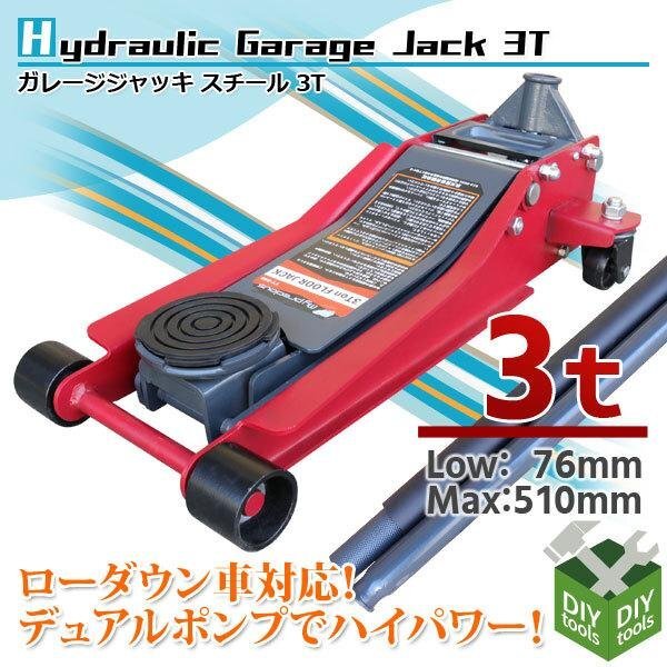 > 丸型保護パッド付き ガレージジャッキ 油圧式 3t 油圧ジャッキ フロアジャッキ 3トン スチール 最低76mm 最高510m ローダウン車対応