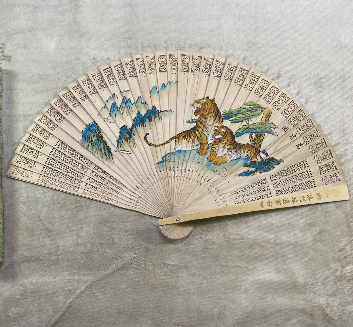 - 中古 香木掛扇 中国 虎柄 両面柄 巨大扇子 縦50cm 展開時90cm