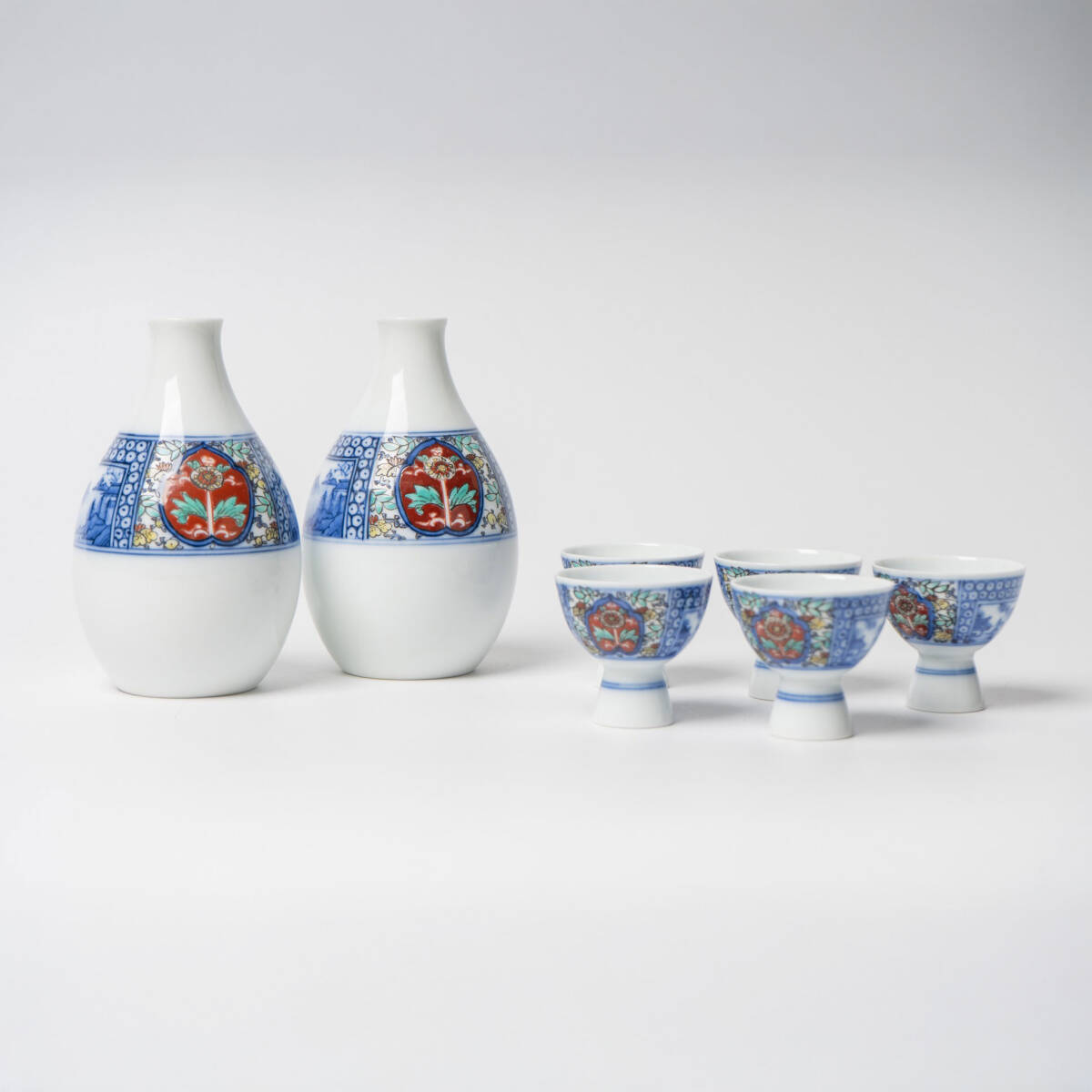 > 十三代 酒井田柿右衛門 染錦山水地文酒器(7点セット)徳利 お猪口 盃 有田焼 共箱