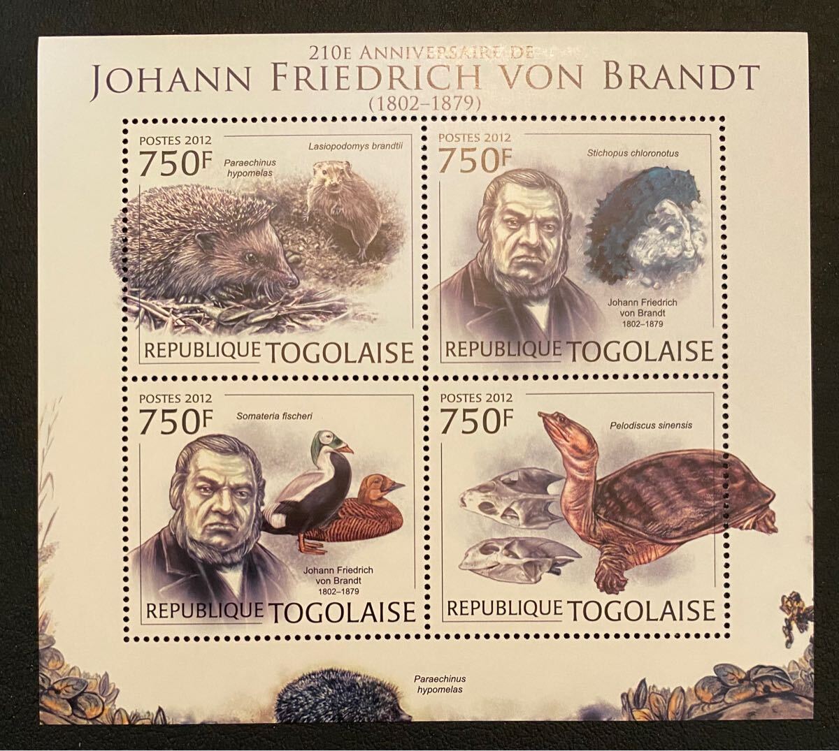 - トーゴ ヨハン・フリードリヒ・フォン・ブラント 博物学者 シカクナマコ ハリネズミ メガネケワタガモ 亀 小型シート1種 未使用 NH