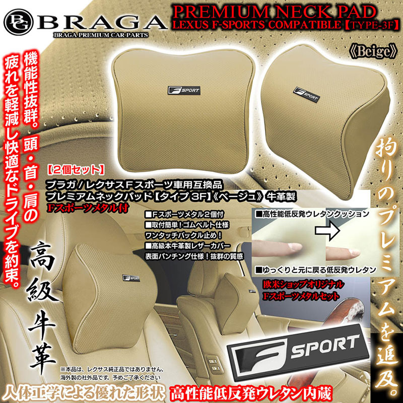 > レクサス Fスポーツ メタル付/タイプ3F プレミアムネックパッド/ベージュ 2個セット/低反発ウレタン内蔵/牛革製パンチングレザー/ブラガ