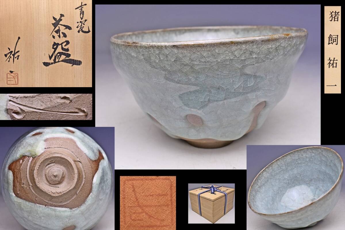- 猪飼祐一 ★ 青磁 茶碗 ★ 共箱 ★ 師: 人間国宝 清水卯一 ★ 大振りで堂々とした造形に釉景見事な上作 ★ 茶道具 ★ 京都 ★