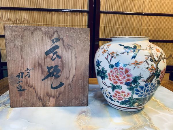 > 九谷焼 金彩色絵牡丹梅花鳥文花瓶 花器 飾壺 華道具 茶道具 壺 飾り 骨董 工芸品 美術品#2fho2