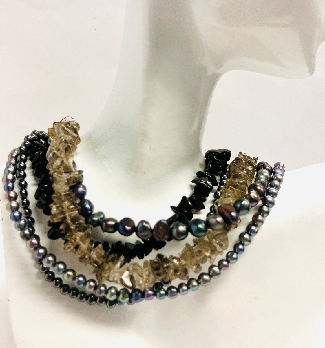 - qoj.Z2204 三越 天然石 スモーキークオーツ×黒淡水真珠 5連ネックレス 4.0~4.5mm玉 GP金具