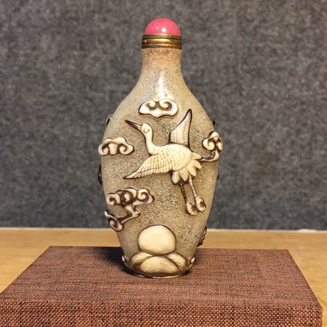 - ▽鴻▽ 琉璃製 細密彫 仙鶴紋 鼻煙壺 根付 裝身具 古賞物 中国古玩 中国古美術