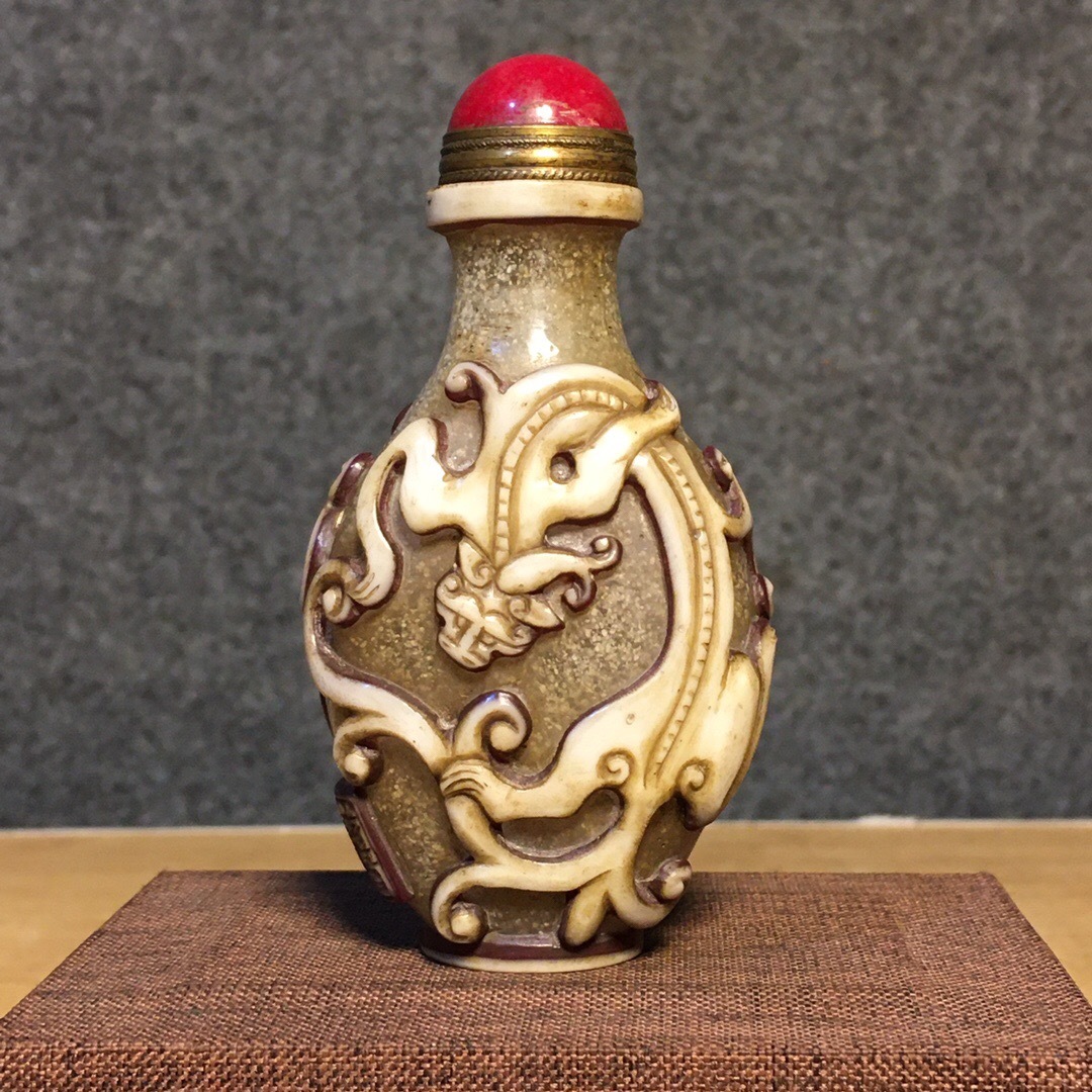 - ▽鴻▽ 琉璃製 細密彫 神獣紋 鼻煙壺 根付 裝身具 古賞物 中国古玩 中国古美術