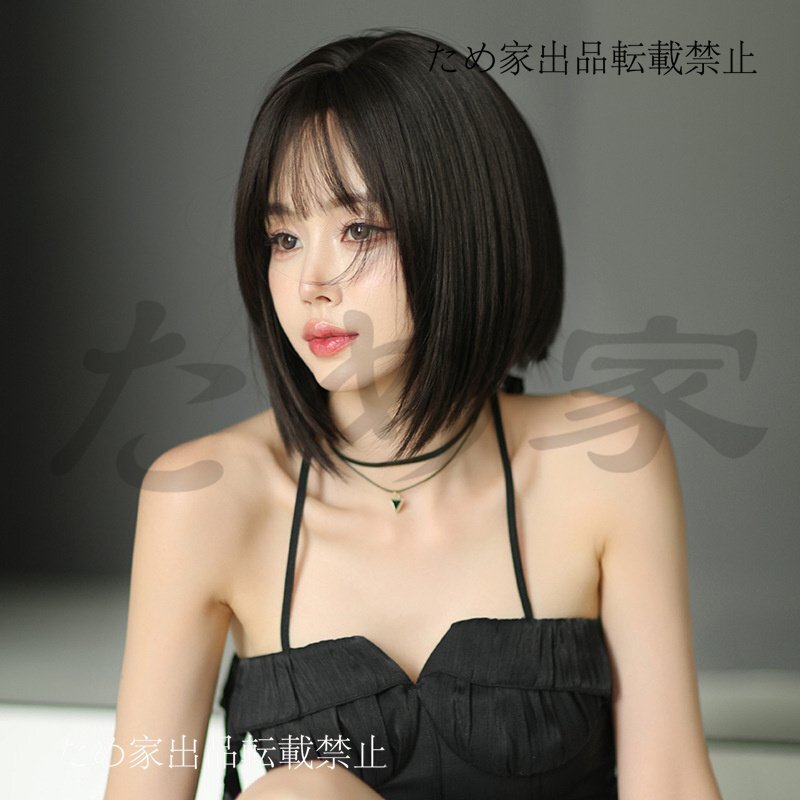- 新品人毛 ショートストレートウィッグ 毛先内巻き ブラックティーブラウン つむじ部分手植え 自然に見えますフルウィッグ