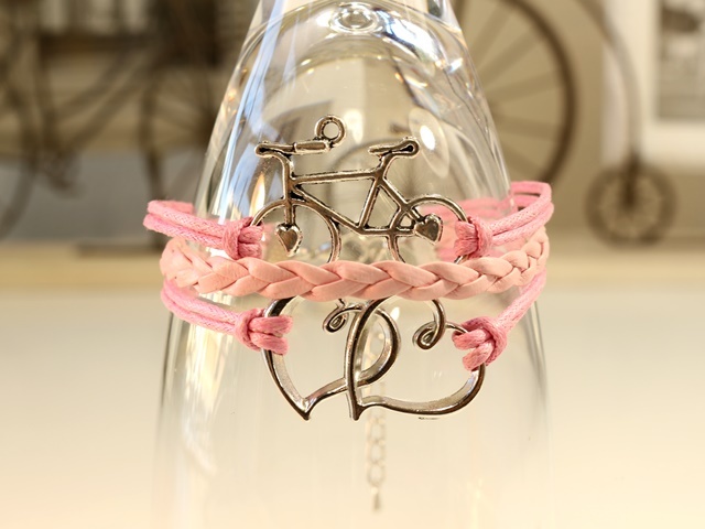 - ブレスレット レディース メンズ ペア 編み込み 自転車ブレス 自転車チャーム 重ねづけ 自転車モチーフ ブレス ピンク