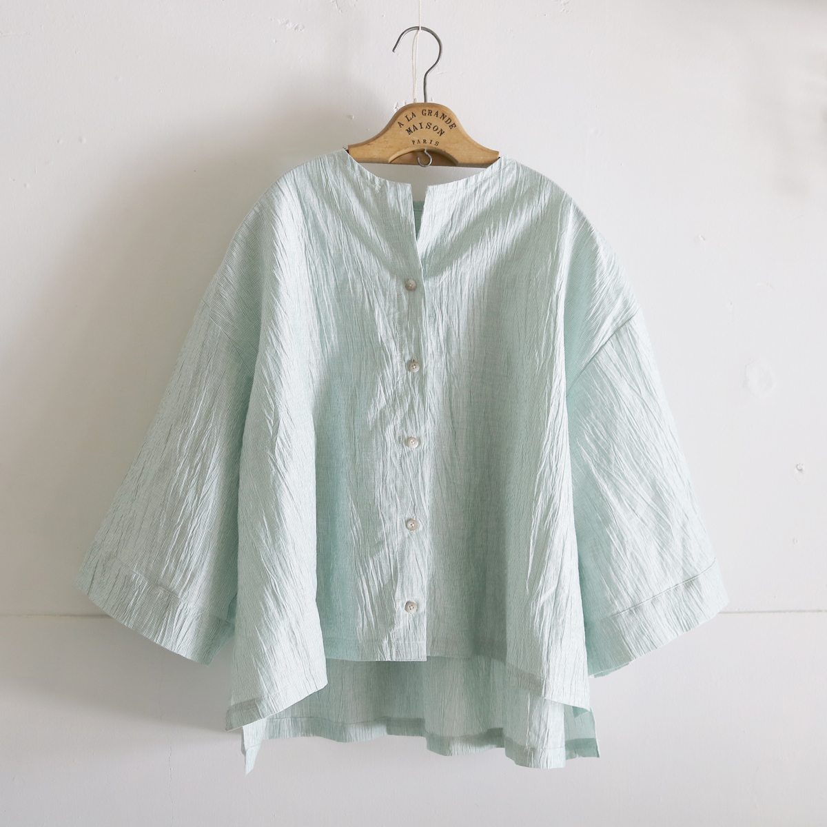 - 【koko cinema】Aラインシャツ 後ろ下りのノーカラーシャツ/コットン アンティーク ブラウス フランス映画のようなお洋服 ビンテージ
