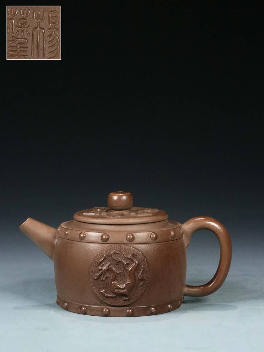 > 【博古斎】 中国茶器 宜興紫砂【楊葆年&開窓蠡竜鼓型壺】急須常滑 茶壷 紫砂壷 煎茶道具 唐物 時代物 古陶芸 AU-05188