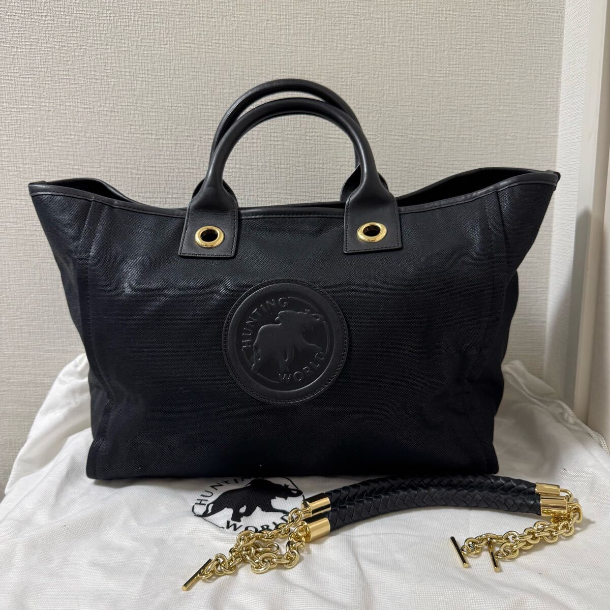 > 【大幅値下げ】【新品同様】HUNTING WORLD ハンティングワールド 2way トートバッグ ブラック 黒 チェーン ハンドバッグ