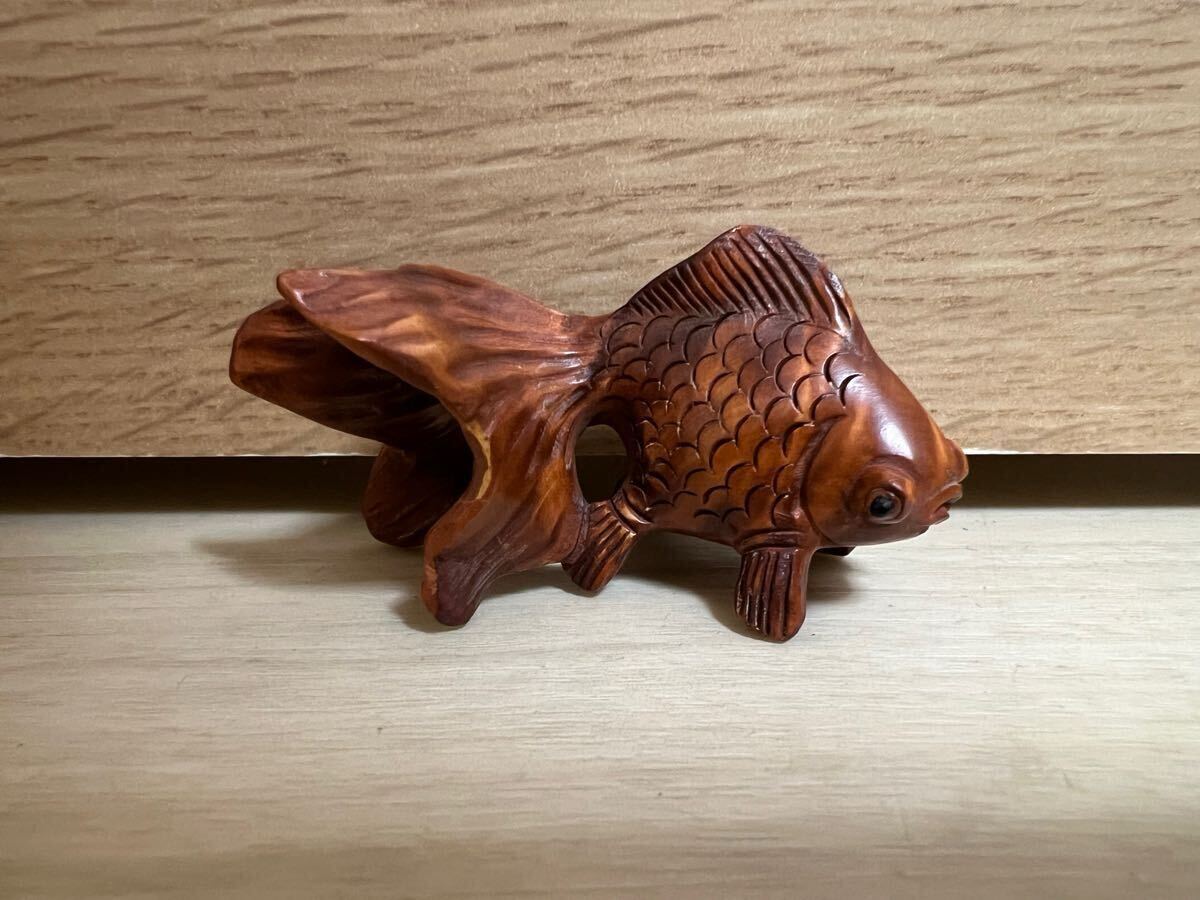 - 木彫り 金魚 出目金 清代朱漆木彫金魚筆架 置物 フィギュア 当時物 根付け 銘入り 玉松 在名