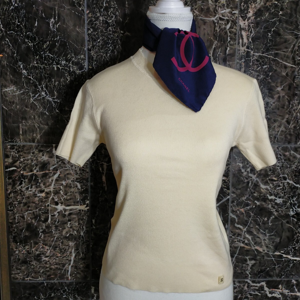 > 極美品 CHANEL ココマーク付きショートスリーブニット オフホワイト 肉厚コットン100% 02C サイズ40 MADE IN FRANCE オールシーズン対応可