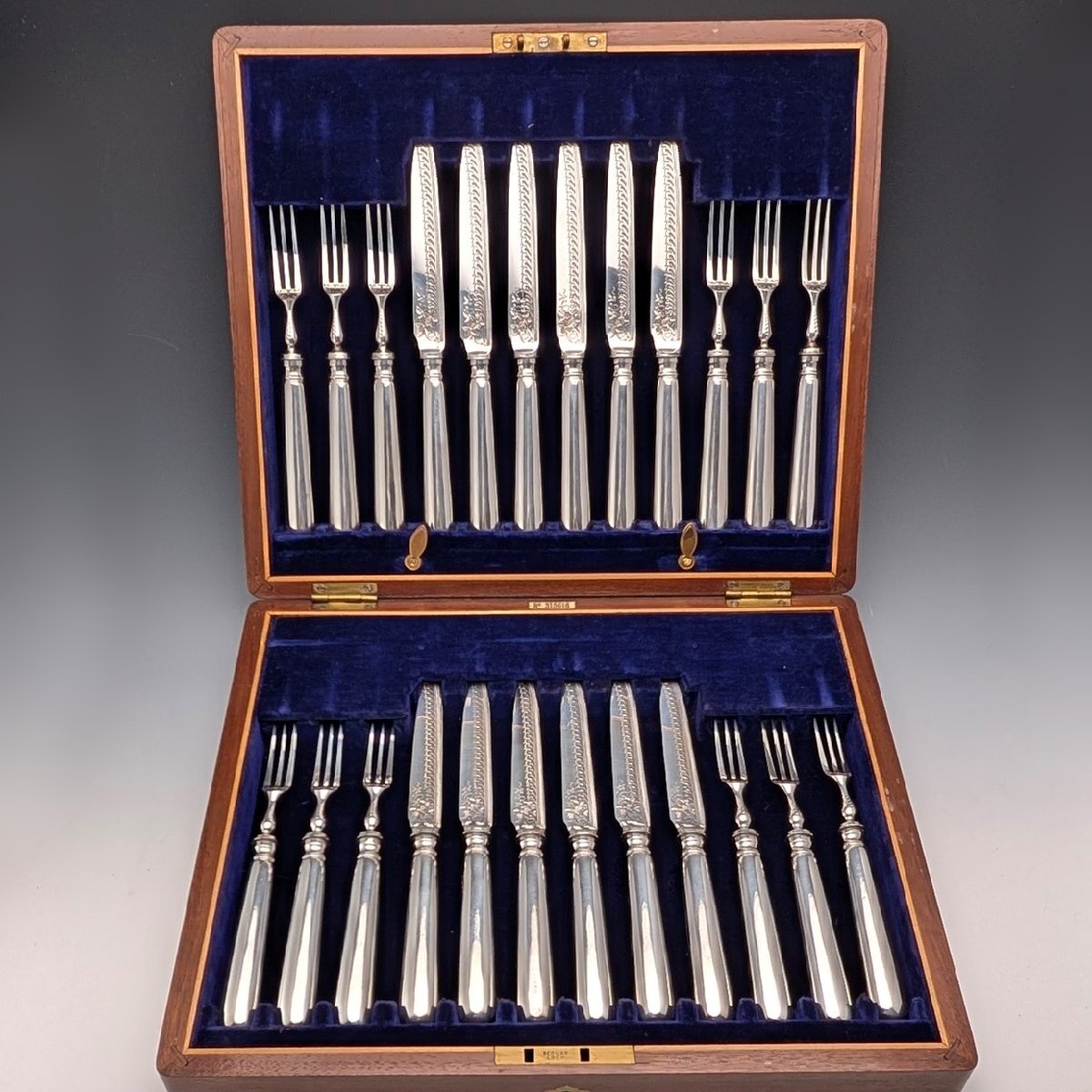 シルバープレート製の小ぶりのデザートカトラリー12ペアセットとなります。