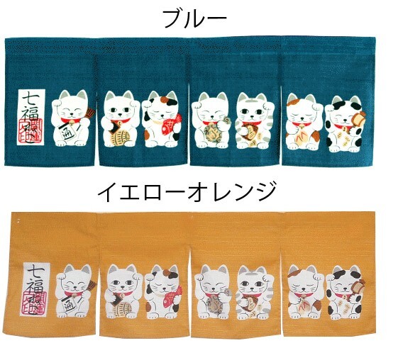- 和風のれん綿100% ショート幅85×丈30センチ七福ねこ!!「招き猫柄」色はイエローオレンジ色でお届けします。