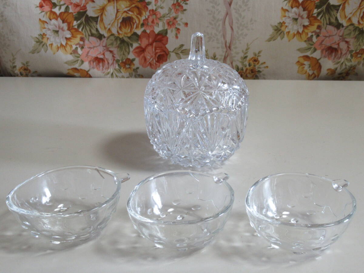 - R7 05★レトロ アンティーク キャンディーポット&ガラス小鉢皿3個セット 蓋付き小物入れ 未使用