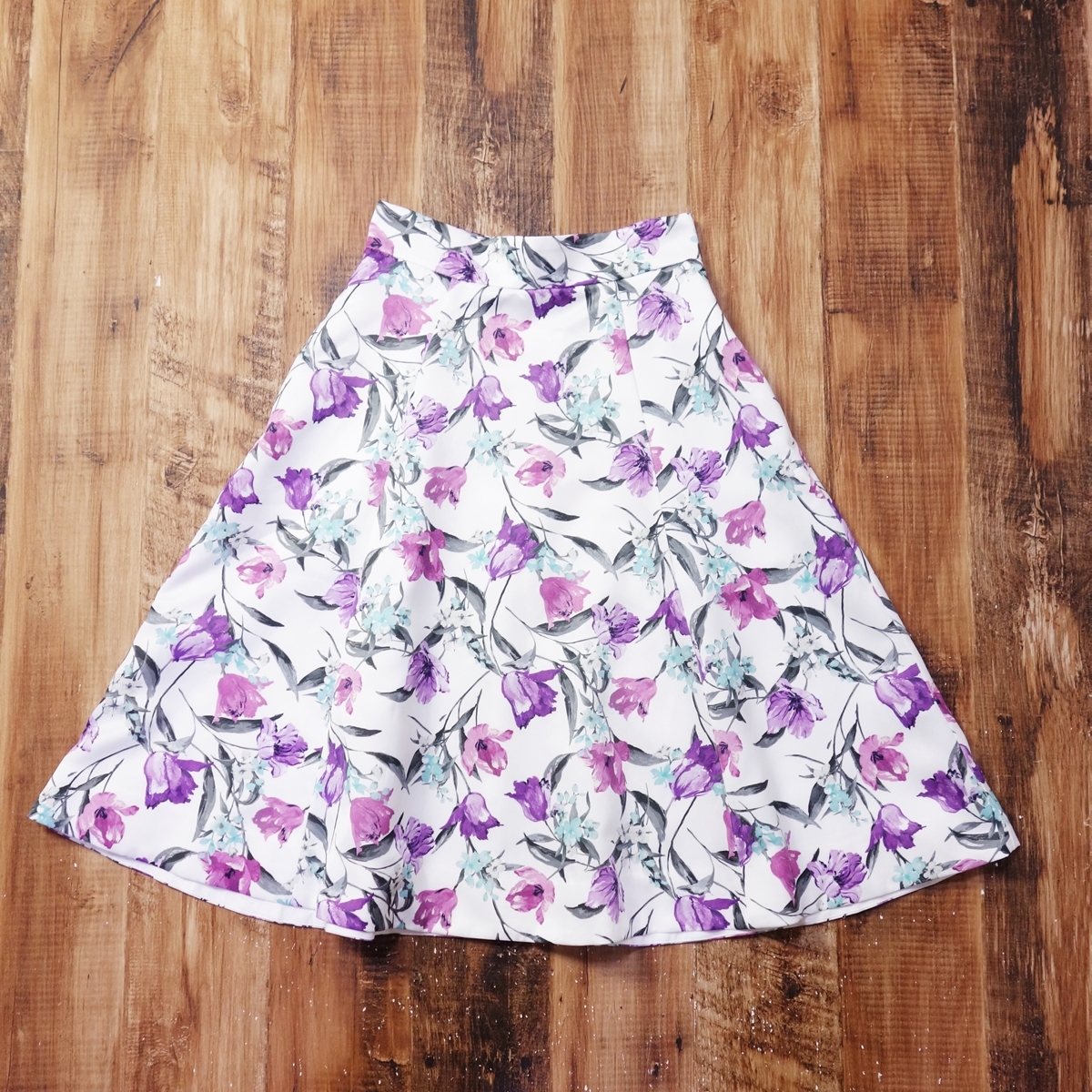 - 美品 アプワイザーリッシェ Apuweiser-riche 大花プリントフレアスカート ひざ丈 花柄 総柄 フェミニン 0 XS ホワイト / パープル LK25