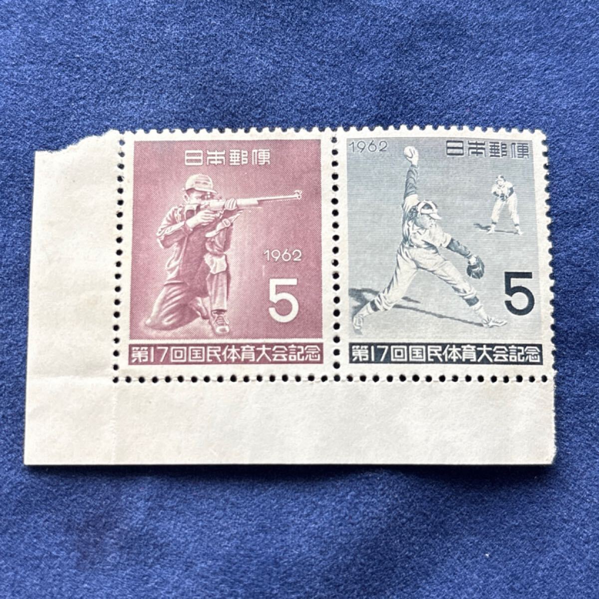 - 記念切手【第17回国民体育大会記念】連刷 2種完 1962年 野球 射撃 スポーツ 日本郵便 昭和レトロ コレクション Japan 送料無料