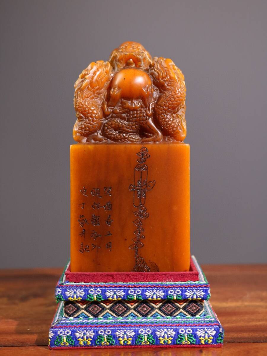 - 『館蔵珍品 寿山石 田黄石 細密彫 神龍護主印章 印章 印鑒』文房具 書道品 貴重物品 収蔵品 中国古美術 時代物 古董品