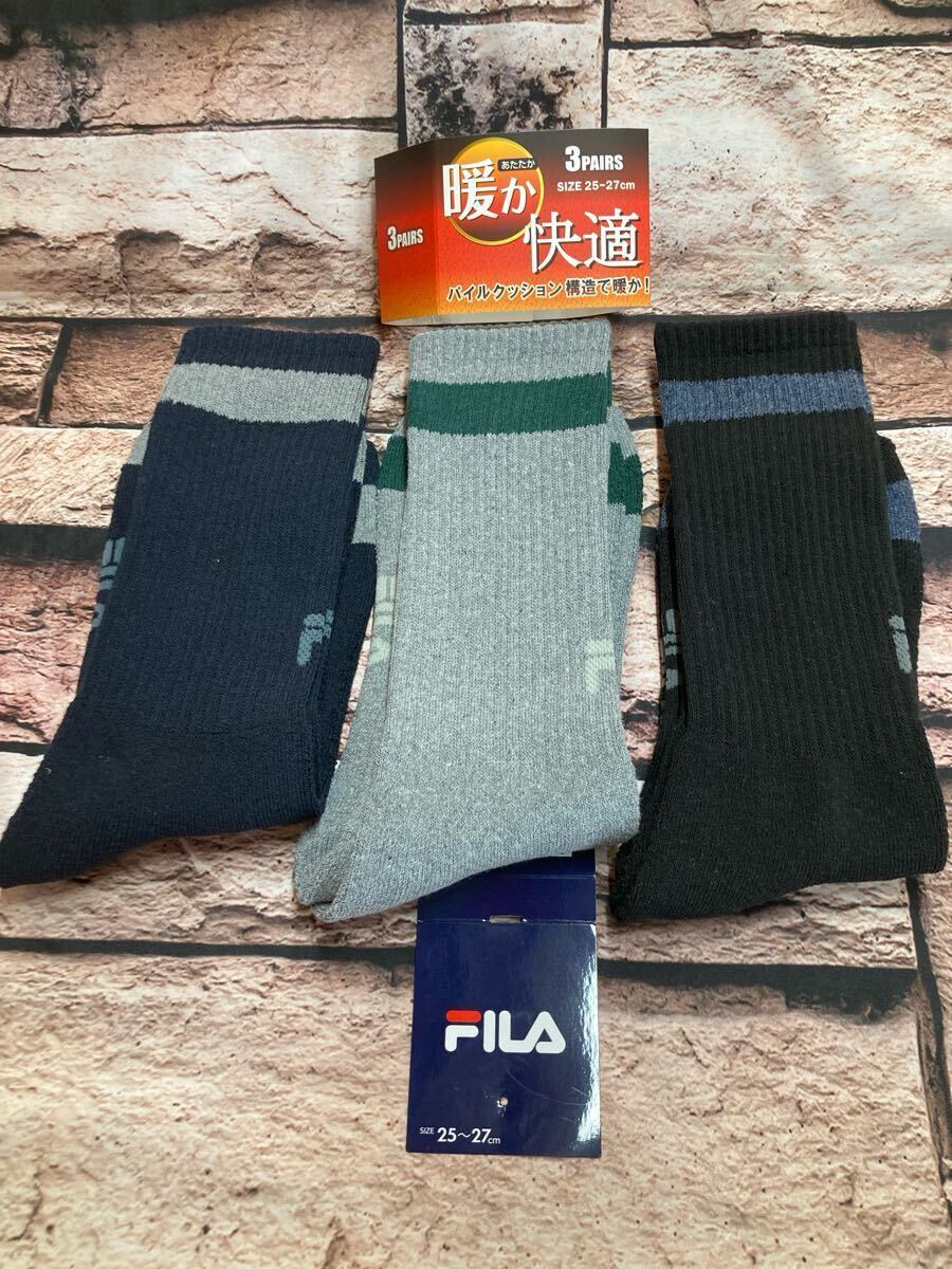 - 『画像から3足組』足底パイルクッションで暖か&快適な履き心地!【FILA】メンズクルー丈 綿混パイルソックスA柄