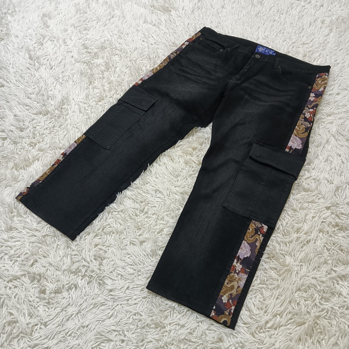 > ★雅結 SB39007-D ブラックデニム カーゴパンツ ジーンズ ジーパン ボトムス 和柄 ちりめんライン size36 みやびむすび 流儀圧搾 古着 USED