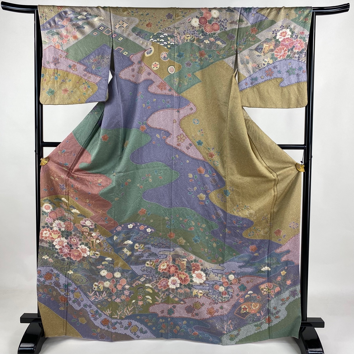 > 【在庫一掃】 訪問着 身丈167.5cm 裄丈66cm M 袷 草花 鴛鴦 金彩 絞り 灰緑 正絹 美品 名品 【中古】