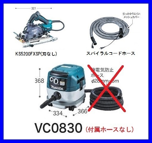- マキタ 125mm 防じん丸のこ [KS5200FXSP] + 8L粉じん専用集じん機 [VC0830]【付属ホースなし】+ スパイラルコードホース [A-65121]