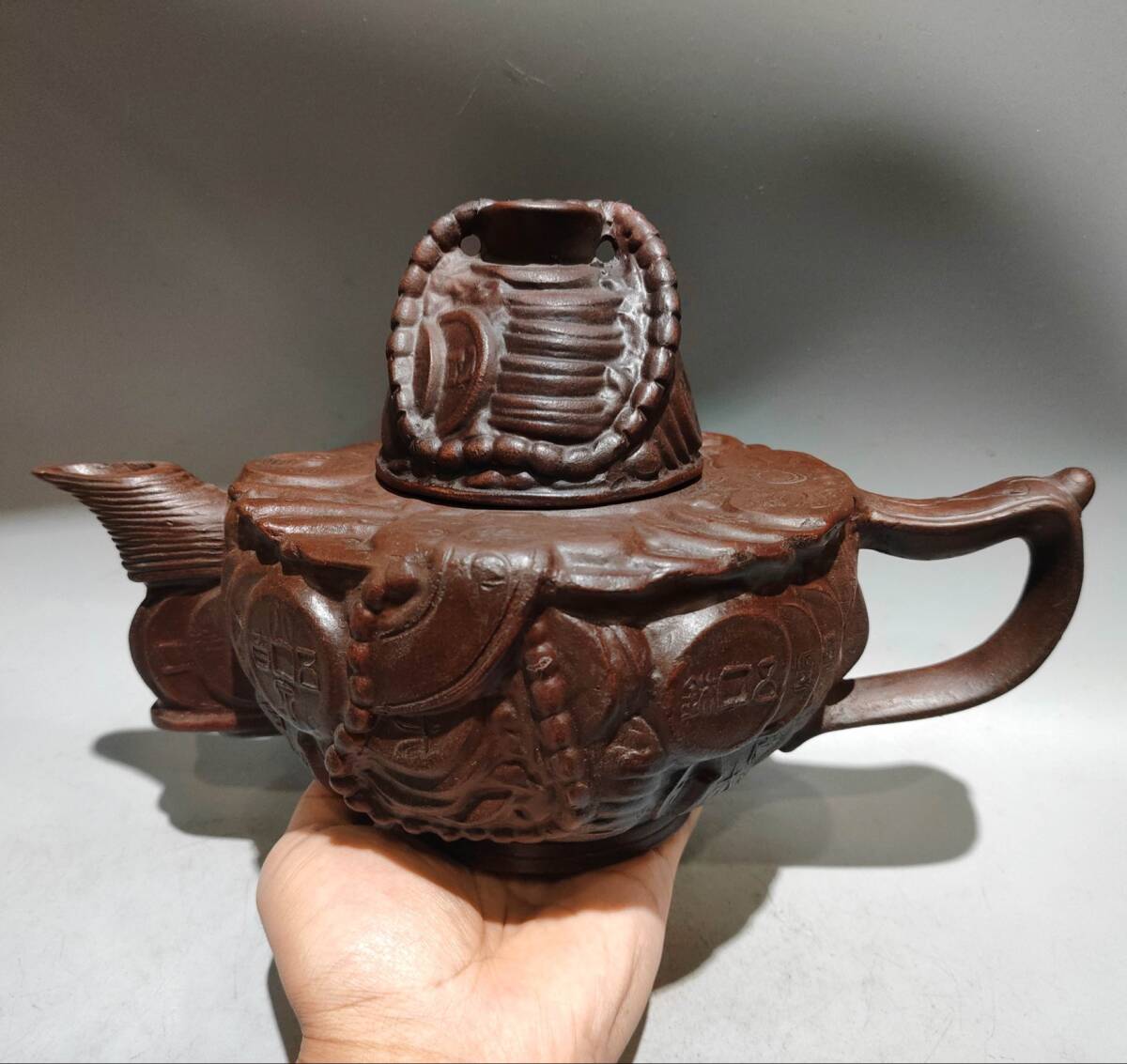- 【超珍館蔵】紫砂壺 聚寶盆壺 陳鳴遠款 紅泥 茶具 茶道品 置物 賞物 古賞物 古董品 古美術品 時代物 旧家蔵出 稀少珍蔵品