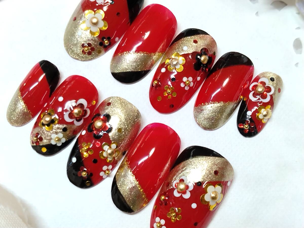 - 即決☆ジェル加工済ネイルチップ☆レギュラーS 和風 ラメフラワーレッド 着物 成人式