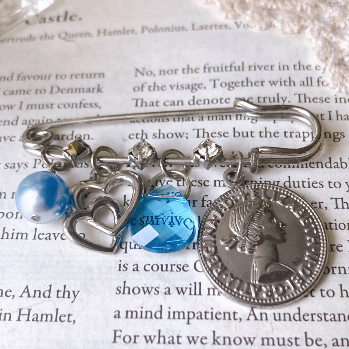 - 安全ピンブローチ シルバー サムシングフォー コイン オープンハート ガラス 美品☆vintage jewelry accessoriesR0532