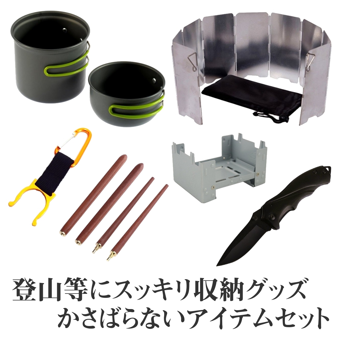 - 登山セット ナイフ ポケットストーブ 風除版 折り畳み箸 クッカー ペットボトルホルダー 6点セット
