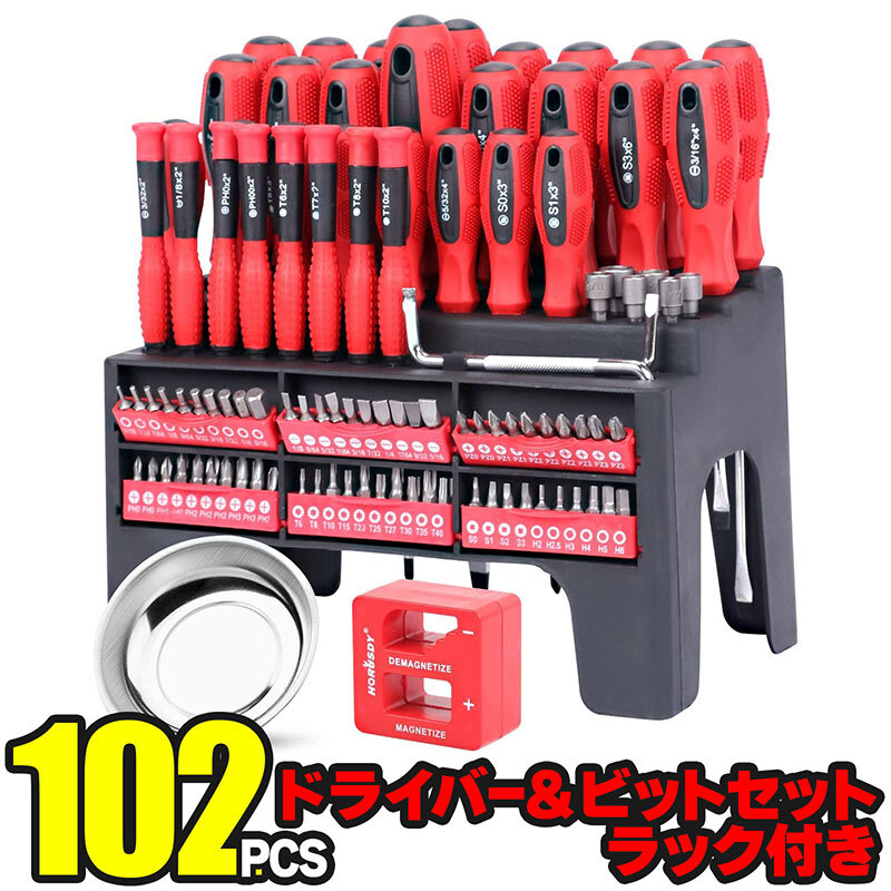 - ラック付き ドライバー&ビットセット 102PCS トレイ マグネタイザー ラチェット