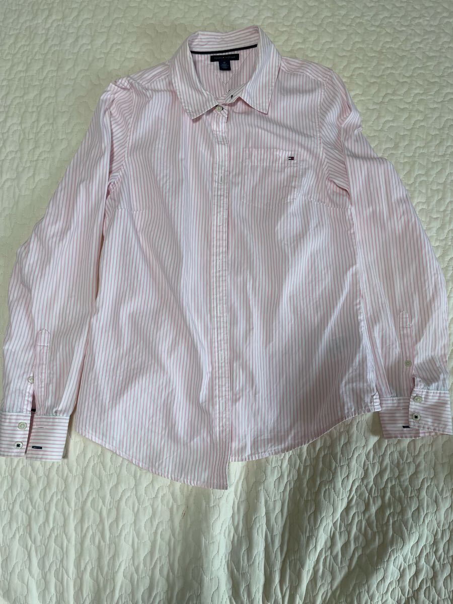 - TOMMY HILFIGER トミーヒルフィガー ボタンダウン 長袖シャツ ピンクストライプ ワンポイントロゴ刺繍 サイズM シャツ コットン100%