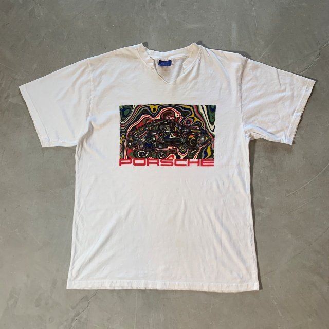 > 【L】90s PORSCHE プリントTシャツ 白■ビンテージ オールド アメリカ古着 車 モーター系 ポルシェ サイケデリック アブストラクトアート