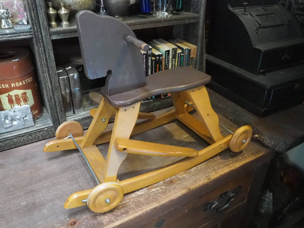 - 【木製ロッキングホース2way】昭和レトロベビーチェア乗用玩具カート古道具アンティーク骨董インテリア椅子インダストリアルおもちゃベンチ