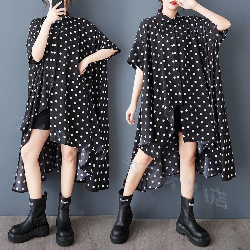 - 新品★春夏 カジュアル ゆったり大きいサイズ 不規則 シャツ ワンピース ドット柄