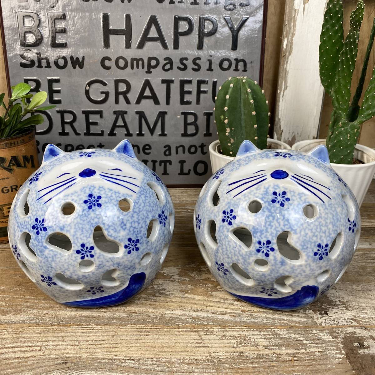 - 染付陶器、藍色まんまる猫小物2点セット、置物、キャンドル入れ、猫雑貨、陶器、アジアン、和室、インテリア小物、ガーデン小物