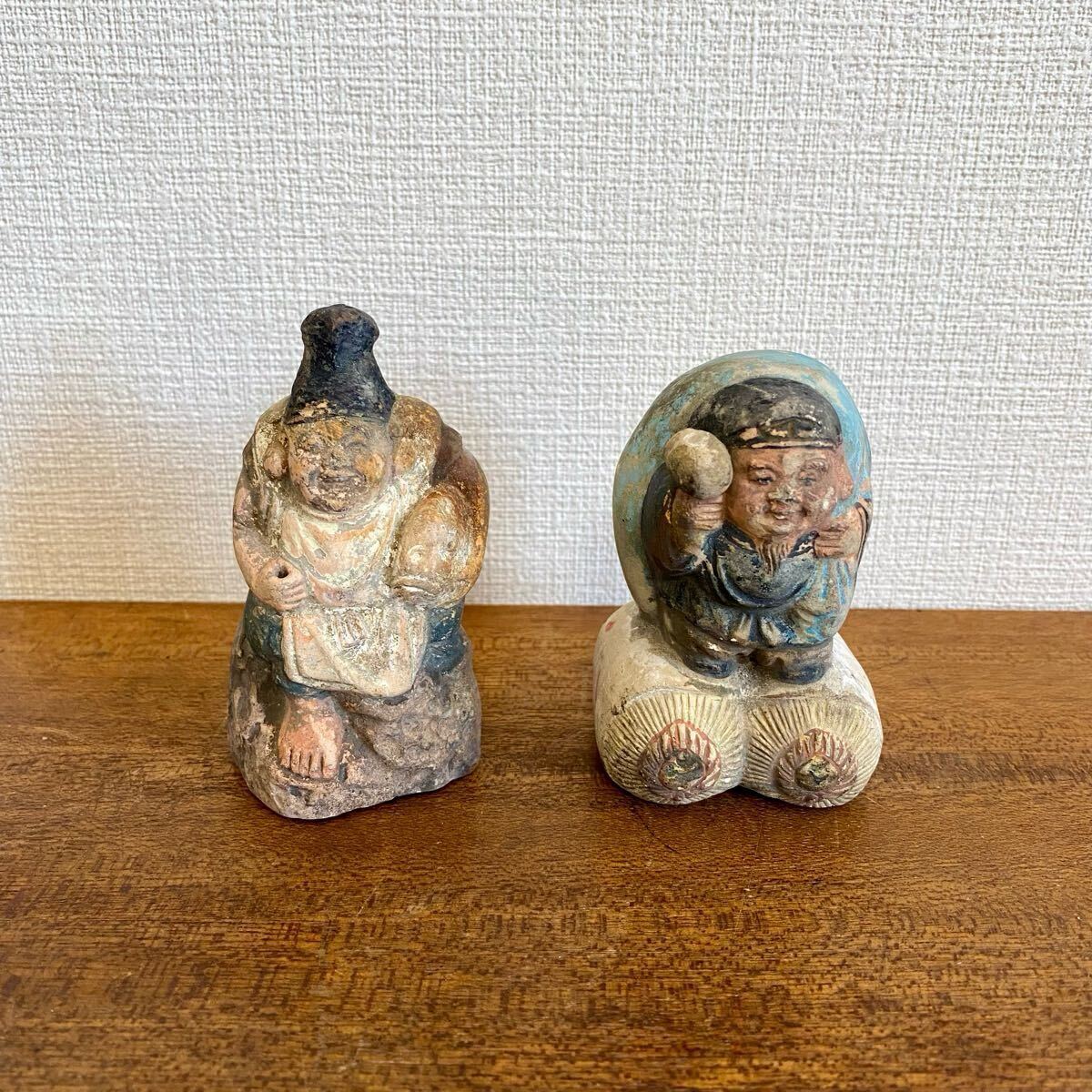 - 当時物 恵比寿天 大黒天 土人形 2点セット / 七福神 縁起物 置物 陶器人形 アンティーク
