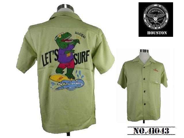 > 【送料無料 44%OFF】HOUSTON ヒューストン 刺繍ボウリングシャツ (ボーリングシャツ) 「DINOSAUR」柄 NO.41043 LIME GREEN_Lサイズ