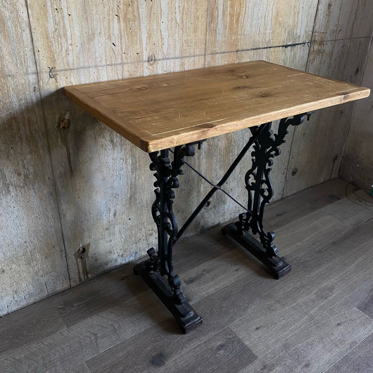 - フランスヴィンテージ 鉄脚×古材 アンティークテーブル カフェテーブル 現状品