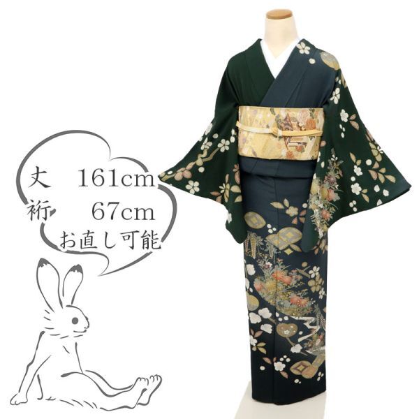 - 【訪問着】 袷着物 吉祥文金彩の四季花模様 墨色グリーン染分け 4HG9
