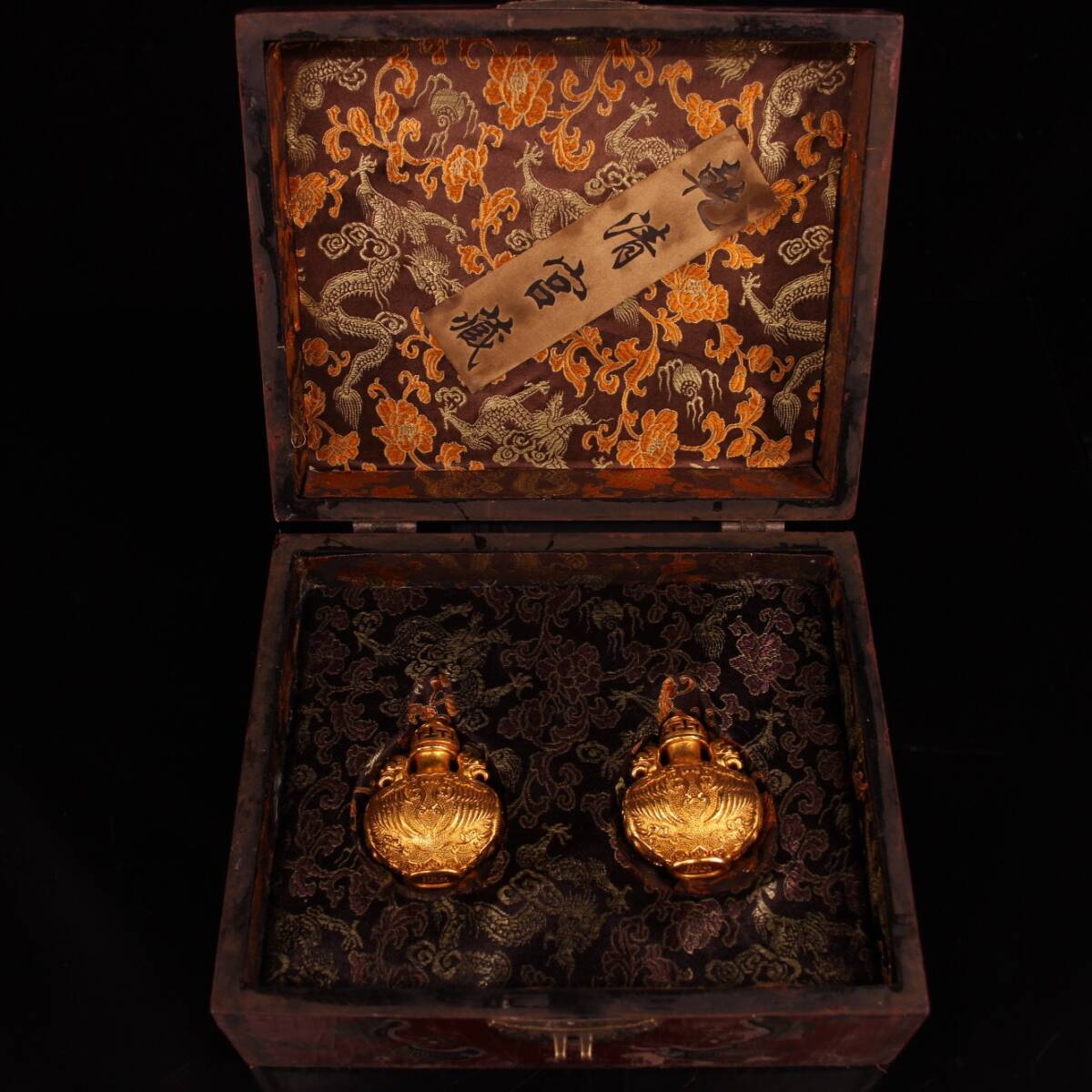 - 蔵友旧蔵出 銅製 塗金 雙鳳凰鼻煙壺一對 箱付 希少珍品 貴重品 置物 古賞物 中国古玩 中国古美術品