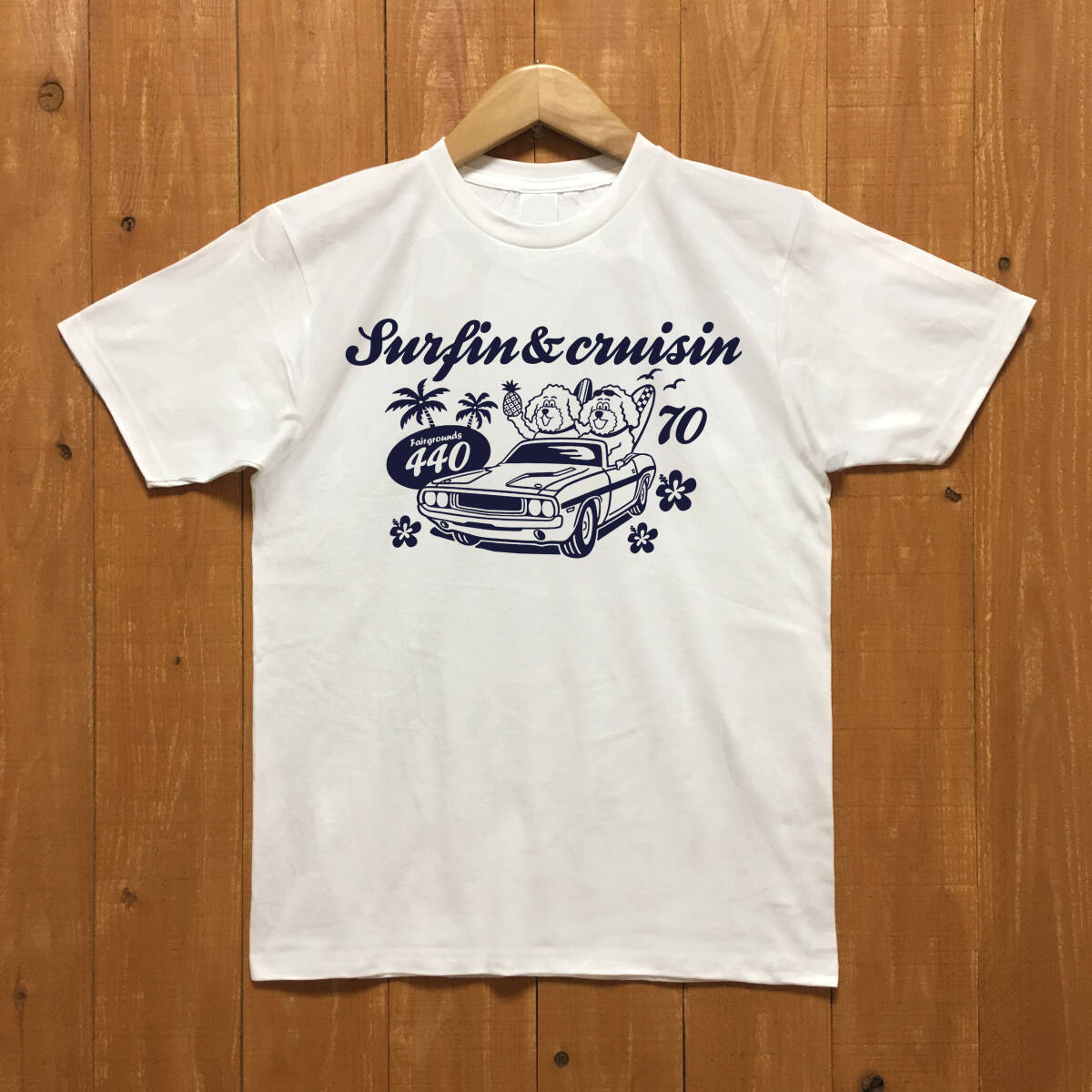 > ■ SURFIN & CRUISIN Tシャツ■Lサイズ(ホワイトxネイビー)アメ車 モパ- MOPAR DODGE CHALLENGER チャレンジャー サーフィン