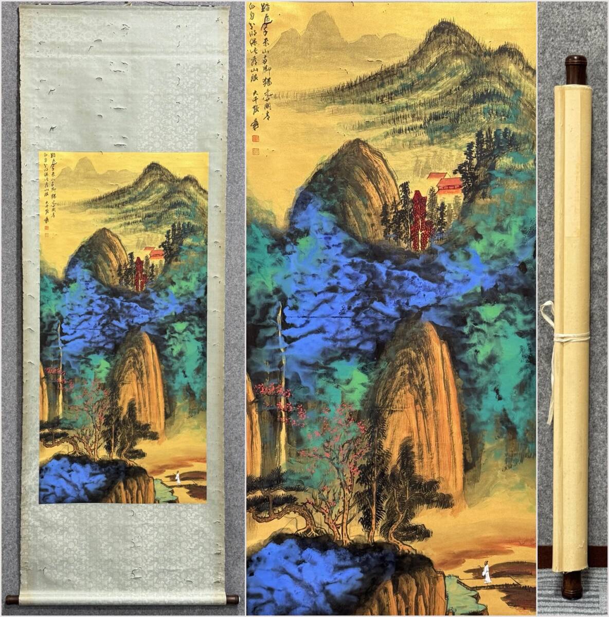 > 古美術 掛け軸 中国・近現代 「張大千書」 紙本 【撥彩山水図】 立軸 書道 巻き物 肉筆保証 唐物 古画 画心134.5x64.5cm LT-250655