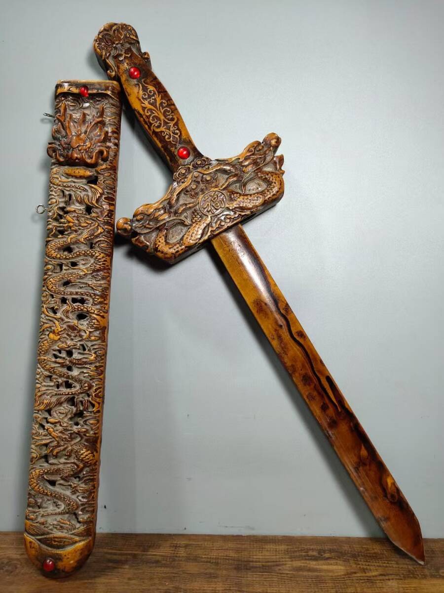 - 古木彫り 秘藏 清代 古桃木宝剣『九龍戯珠』鎮宅魔除け桃木宝剣 書道具 文房具 時代物 中国古美術 細密彫 置物 賞物 唐物 木彫り 文玩 6.5