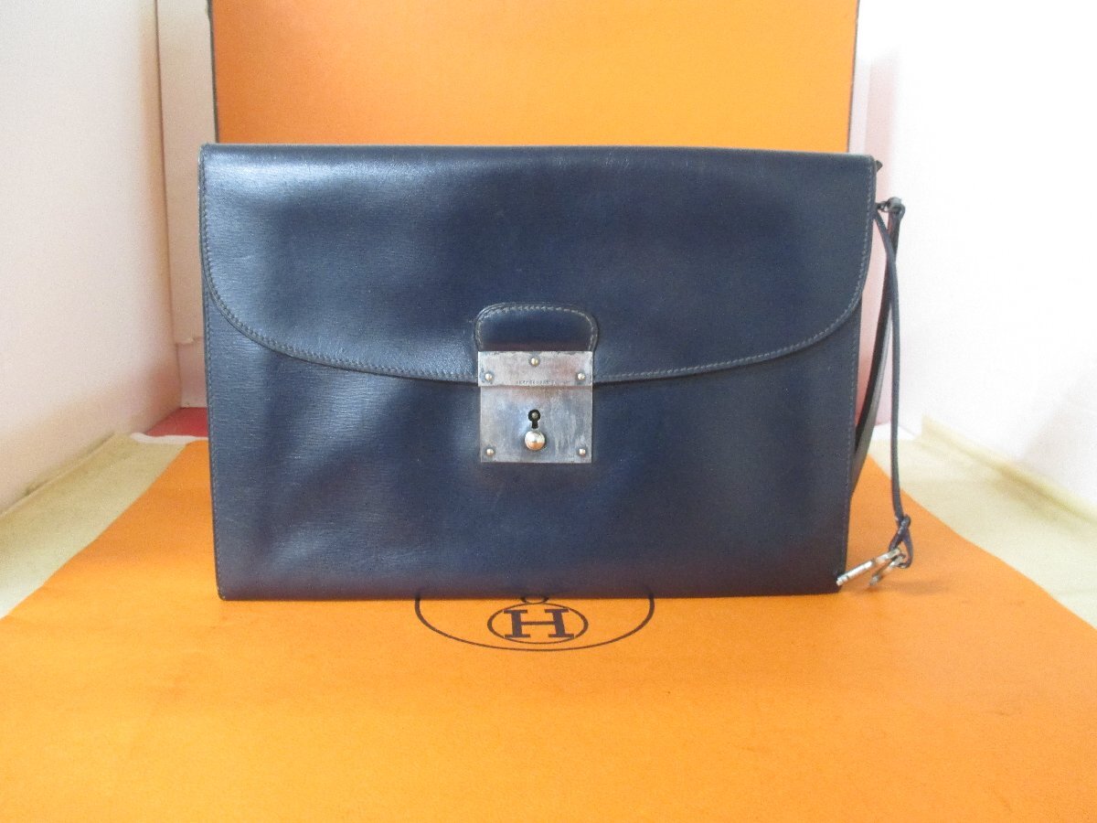 > 本物保証【即決で送料無料】エルメス/キリウス/ネイビー色/ヴィンテージ/レザー/クラッチ/セカンド/S金具/エルメスの鍵2本付属/正規品